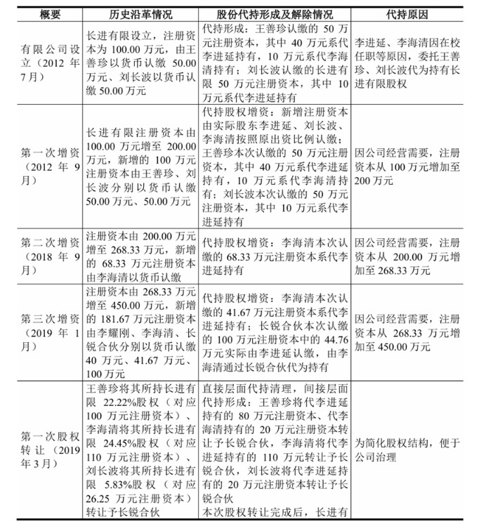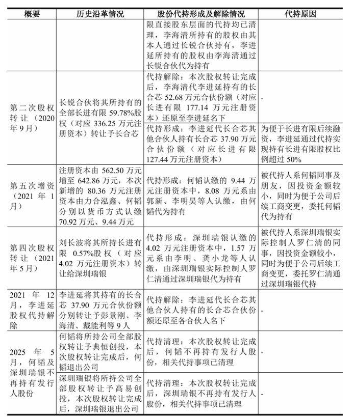 伴随李耀刚套现疑云的,是长进光子更为复杂的股权代持“连环套”,股权权属纠葛贯穿公司发展多年。2020年9月,李进延曾反向为李海清等9名合伙人代持长合芯份额,核心目的是集中公司表决权,强化自身对公司的掌控力;除此之外,股东何韬曾代为持有12名同事及朋友的公司股份,股东深圳瑞银也存在股权代持相关情形。尽管长进光子对外表示,所有股权代持均已在IPO申报前完成清理,例如2025年5月何韬与深圳瑞银通过股权转让退出公司,同步完成对应代持关系的解除,但公司长期、高频且涉及多层级、多人员的股权权属混乱问题,依旧是IPO监管层重点核查的事项。