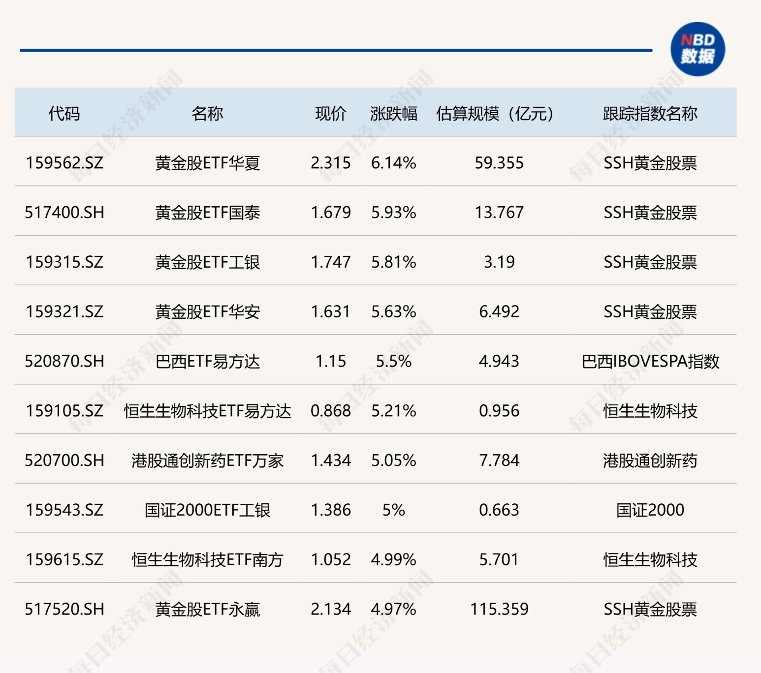 ETF涨跌幅方面,黄金股、恒生生物科技等相关ETF涨超5%。