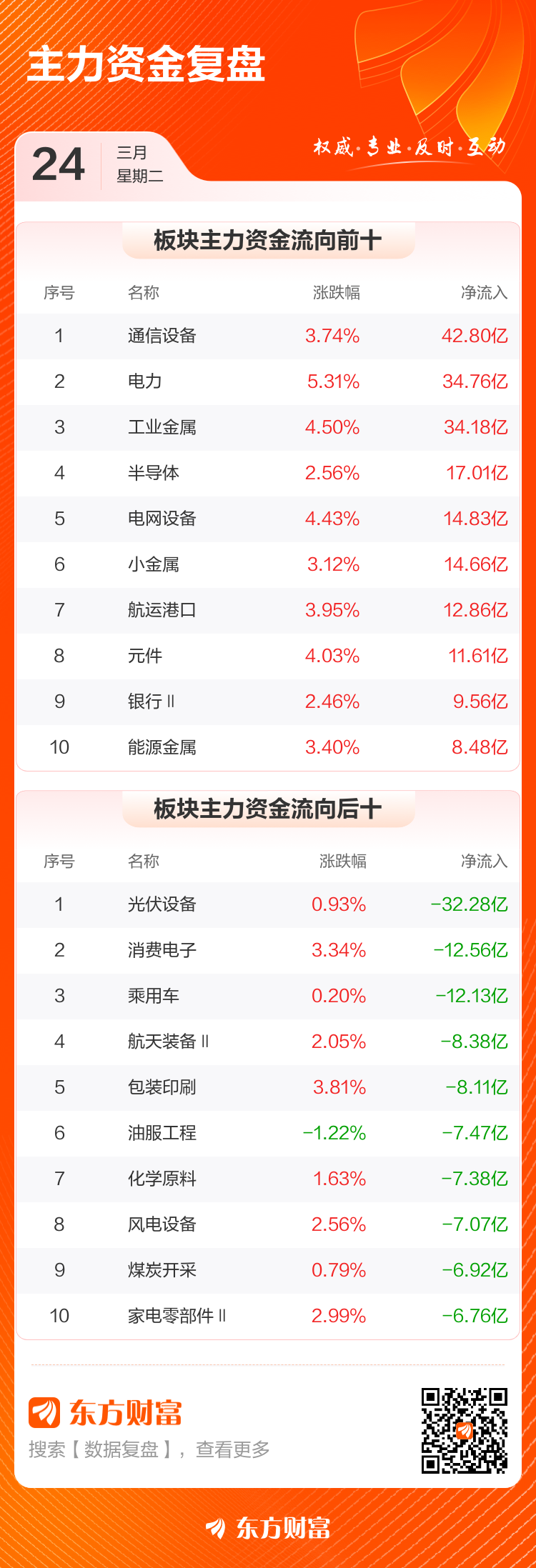 3月24日,沪指涨1.78%,深成指涨1.43%,创业板指涨0.5%。两市成交额2.08万亿,较上个交易日缩量3487亿。数据显示,今日大盘主力资金净流入82.89亿。通信设备、电力、工业金属等板块主力资金流入排名居前,其中通信设备净流入42.80亿元。