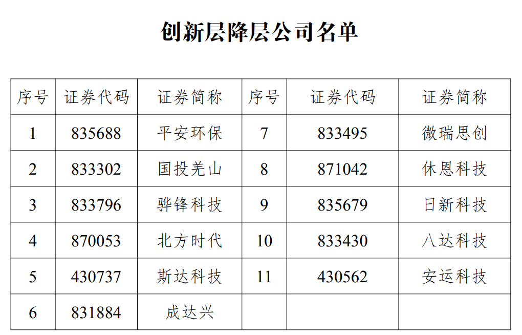 新京报贝壳财经讯3月23日,新三板运营主体全国股转公司发布《关于发布湖南平安环保股份有限公司等11家创新层公司降层决定的公告》。
