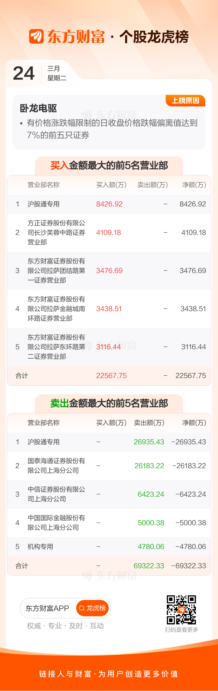 交易所2026年3月24日公布的交易公开信息显示,卧龙电驱因成为有价格涨跌幅限制的日收盘价格跌幅偏离值达到7%的前五只证券上榜。卧龙电驱当日收报38.4元,涨跌幅-5.84%,偏离值-7.62%,换手率7.14%,成交额42.42亿。