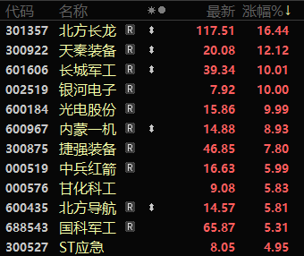 数据显示,在板块12只成分股中,11只个股涨幅均超5%;仅ST应急(300527.SZ)涨幅略低于这一水平,报4.95%。其中,长城军工(601606.SH)、光电股份(600184.SH)、银河电子(002519.SZ)涨停,北方长龙大涨16.44%,天秦装备涨幅也达到12.12%。