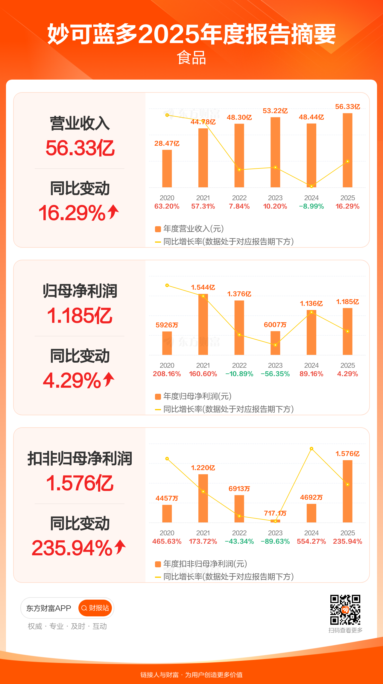 妙可蓝多3月25日发布2025年年报显示,公司全年实现营业收入56.33亿元,同比增长16.29%;归母净利润1.18亿元,同比增长4.29%;扣非归母净利润1.58亿元,同比增长235.94%。每股EPS0.24元,低于机构一致预测的0.67元。
