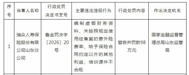 国家金融监督管理总局山东监管局3月24日披露行政处罚信息公开表,因编制虚假财务资料、未按照规定使用经备案的意外险费率、给予保险合同约定以外的其他利益、培训课件不合规,瑞众人寿保险股份有限公司山东分公司被警告并罚款98万元。
