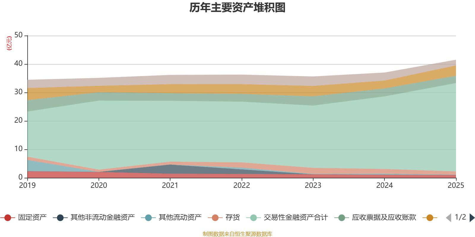 资产重大变化方面,截至2025年末,公司交易性金融资产合计较上年末增加21.83%,占公司总资产比重上升5.94个百分点;存货较上年末减少31.53%,占公司总资产比重下降1.77个百分点;应收票据及应收账款较上年末减少8.63%,占公司总资产比重下降1.42个百分点;长期股权投资较上年末减少76.97%,占公司总资产比重下降1.39个百分点。