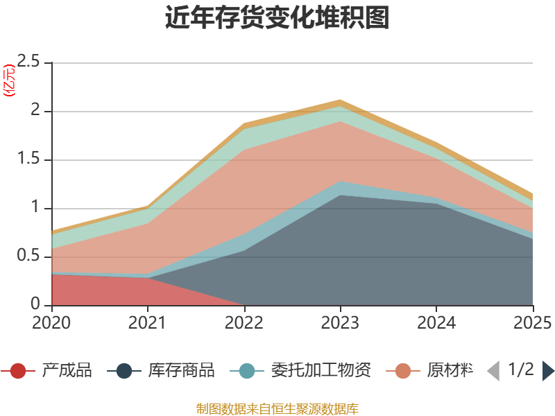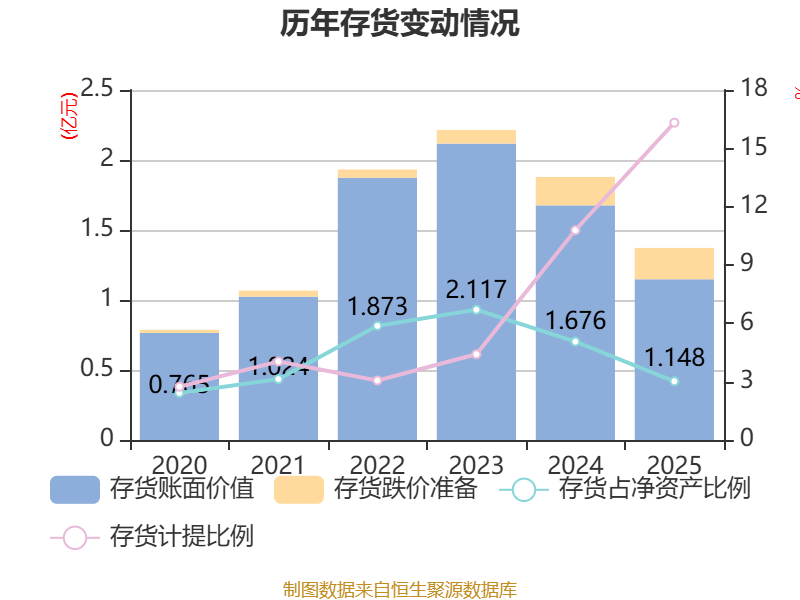 从存货变动来看,截至2025年末,公司存货账面价值为1.15亿元,占净资产的3.02%,较上年末减少5283.82万元。其中,存货跌价准备为2237.66万元,计提比例为16.32%。