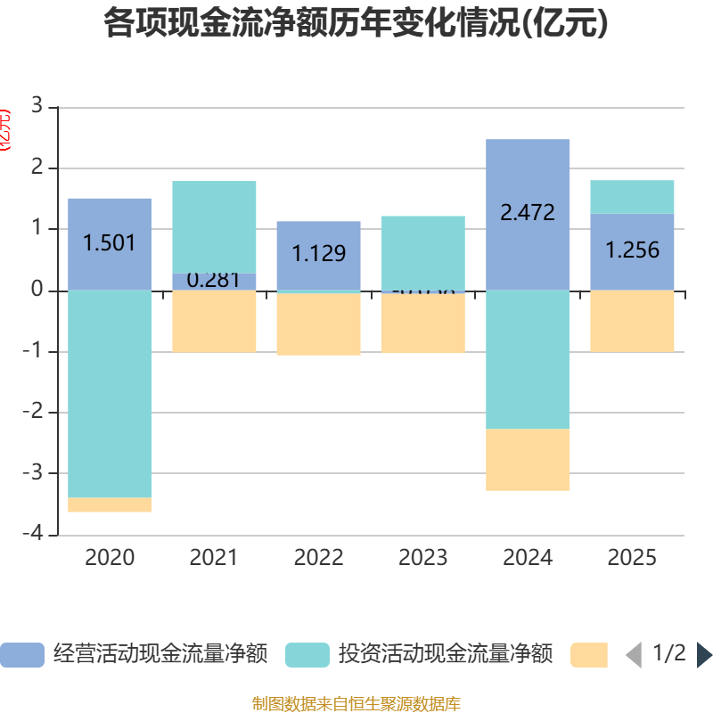 截至2025年,公司经营活动现金流净额为1.26亿元,同比下降49.19%;筹资活动现金流净额-1.01亿元,同比减少3.73万元;投资活动现金流净额5450.42万元,上年同期为-2.27亿元。