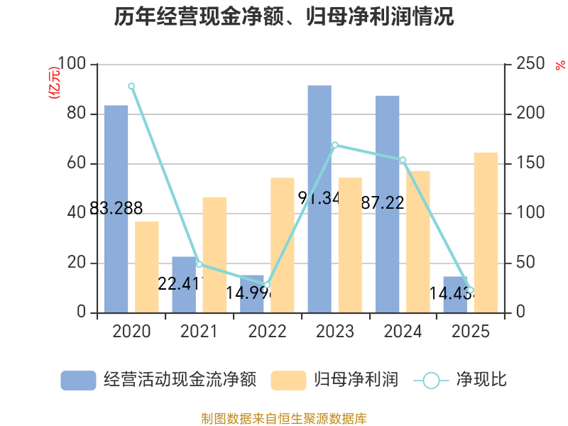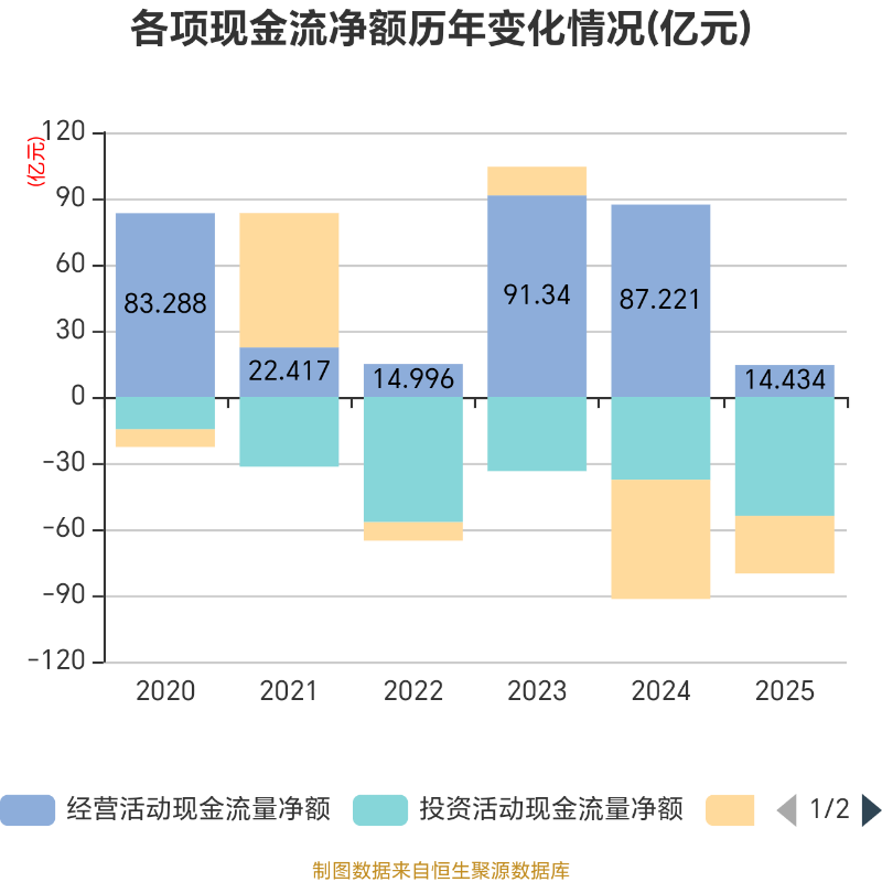 截至2025年,公司经营活动现金流净额为14.43亿元,同比下降83.45%;筹资活动现金流净额-26.13亿元,同比增加27.97亿元;投资活动现金流净额-53.94亿元,上年同期为-37.6亿元。
