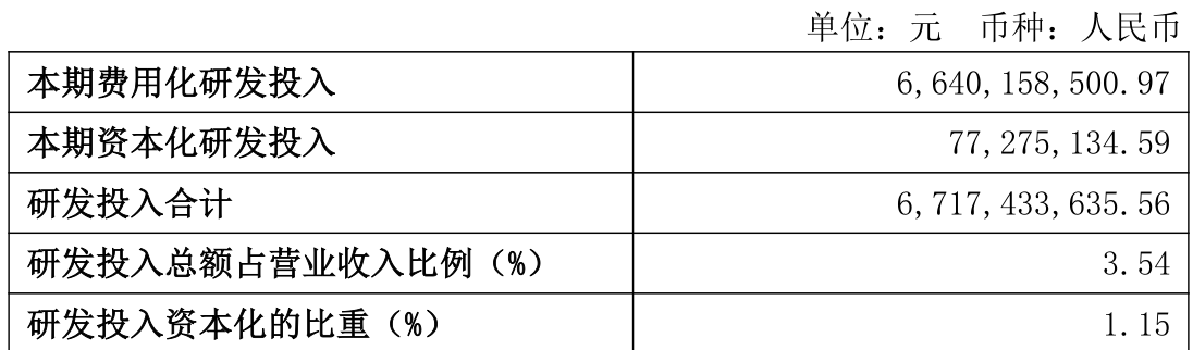2025年全年,公司研发投入金额为67.17亿元,同比增长1.03%;研发投入占营业收入比例为3.54%,相比上年同期下降0.04个百分点。此外,公司全年研发投入资本化率为1.15%。