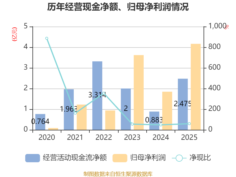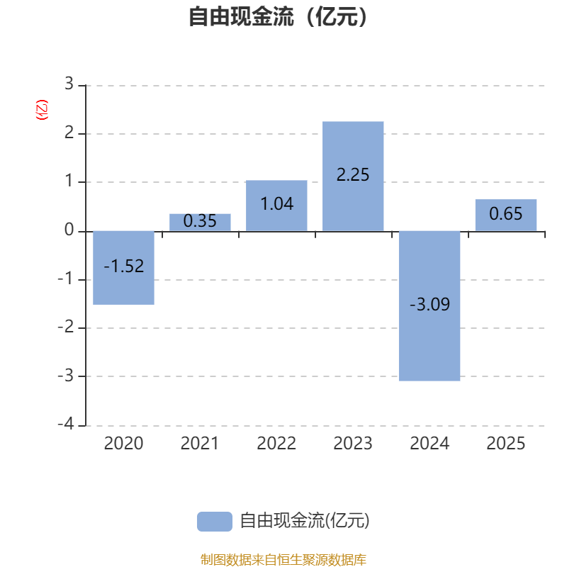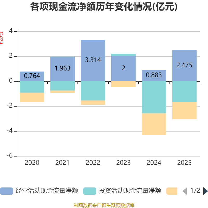 截至2025年,公司经营活动现金流净额为2.47亿元,同比增长180.41%;筹资活动现金流净额-1.38亿元,同比增加3604.03万元;投资活动现金流净额-1.67亿元,上年同期为-2.59亿元。