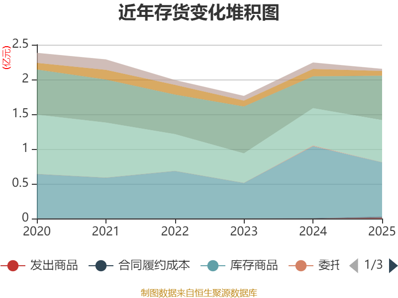 从存货变动来看,截至2025年末,公司存货账面价值为2.15亿元,占净资产的4.65%,较上年末减少925.44万元。其中,存货跌价准备为1765.85万元,计提比例为7.59%。