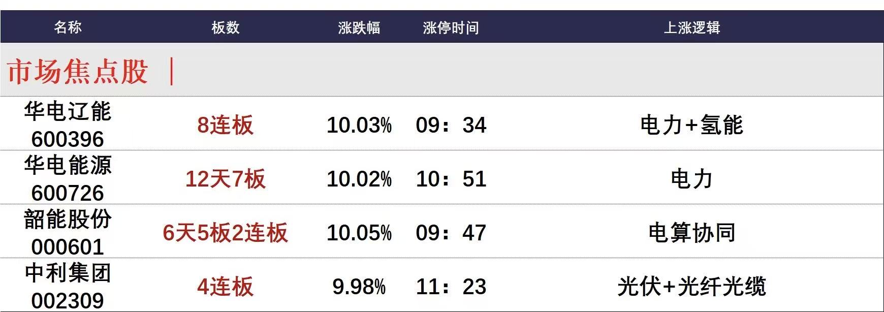 今日午盘全市场共60股涨停,连板股总数18只,14股封板未遂,封板率为77%(不含ST股、退市股)。焦点股方面,电力板块再掀涨停潮,板块内十余只个股涨停,其中华电辽能8连板、华电能源12天7板、韶能股份6天5板。