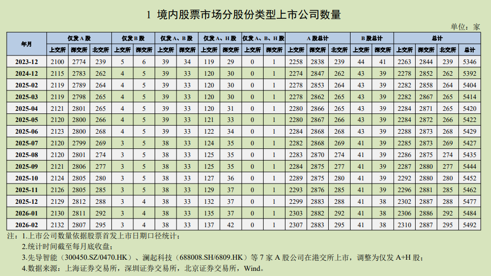 3月25日,中国上市公司协会官网披露2026年2月统计月报。数据显示,截至2026年2月底,境内股票市场共有上市公司5492家,其中上交所2310家、深交所2887家、北交所295家。