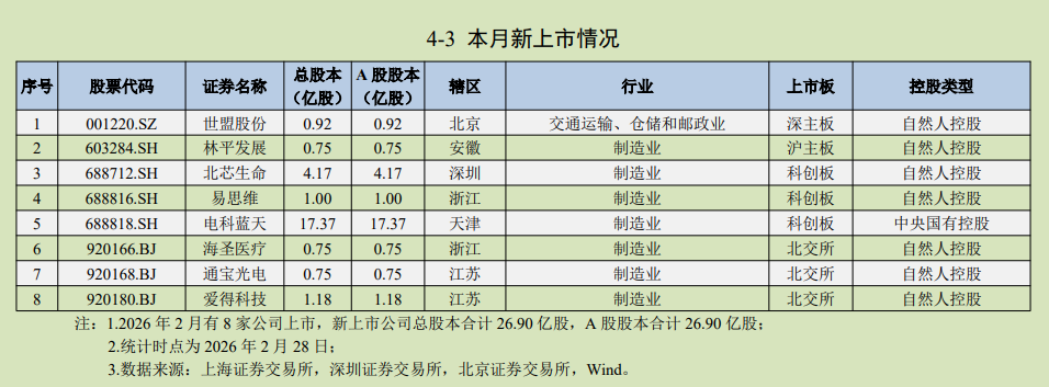 2026年2月新增上市公司8家,该数据于今年1月为9家,2月无退市公司。新增公司中7家来自制造业,1家来自交通运输、仓储和邮政业。