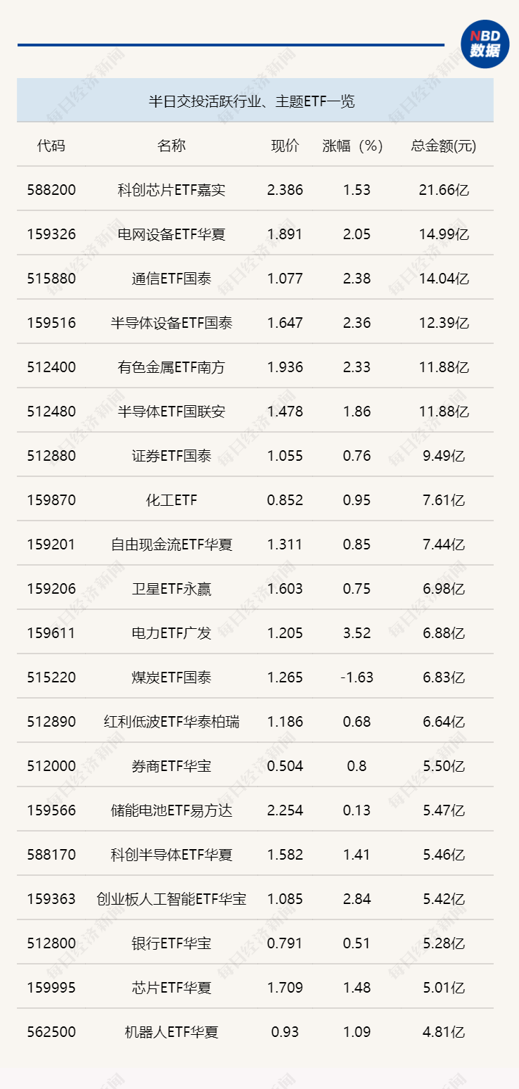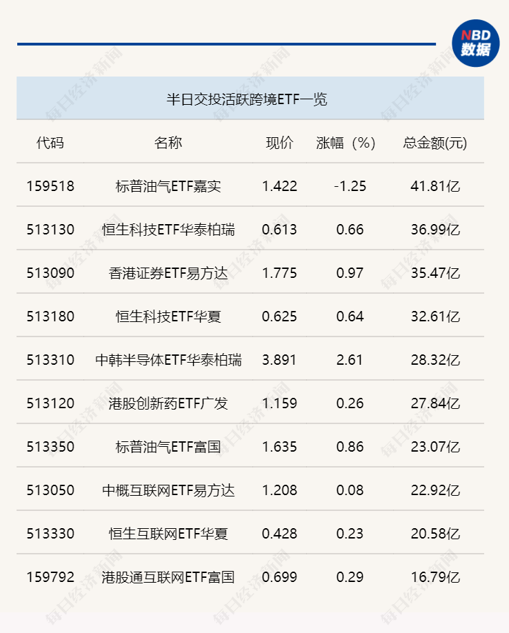 3月25日上午,科创芯片ETF嘉实(588200)成交金额再度突破20亿元,达到21.66亿元,电网设备ETF华夏(159326)等多只ETF半日成交金额也在10亿元以上。跨境ETF方面,标普油气ETF嘉实(159518)半日成交金额为41.81亿元,交投相对活跃。