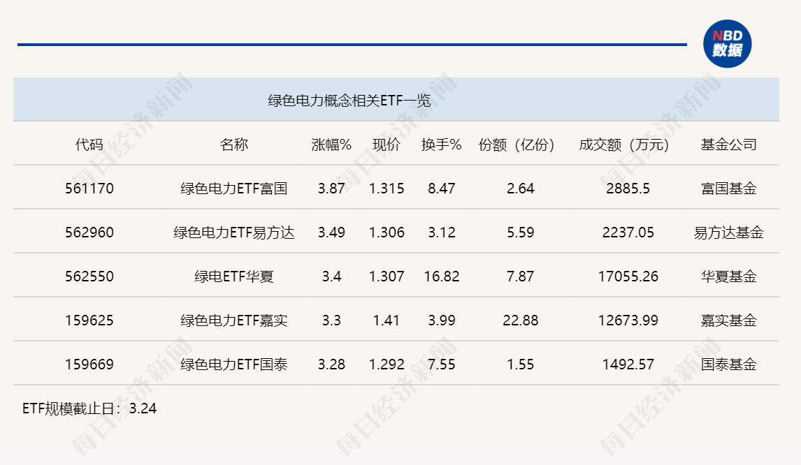 点评:绿色电力ETF嘉实(159625)和绿色电力ETF国泰(159669)和今日上午涨幅分别为3.3%和3.28%,其中,绿色电力ETF嘉实(159625)份额为22.88亿份,半日成交金额为1.27亿元,他们均追踪的是国证绿色电力指数。