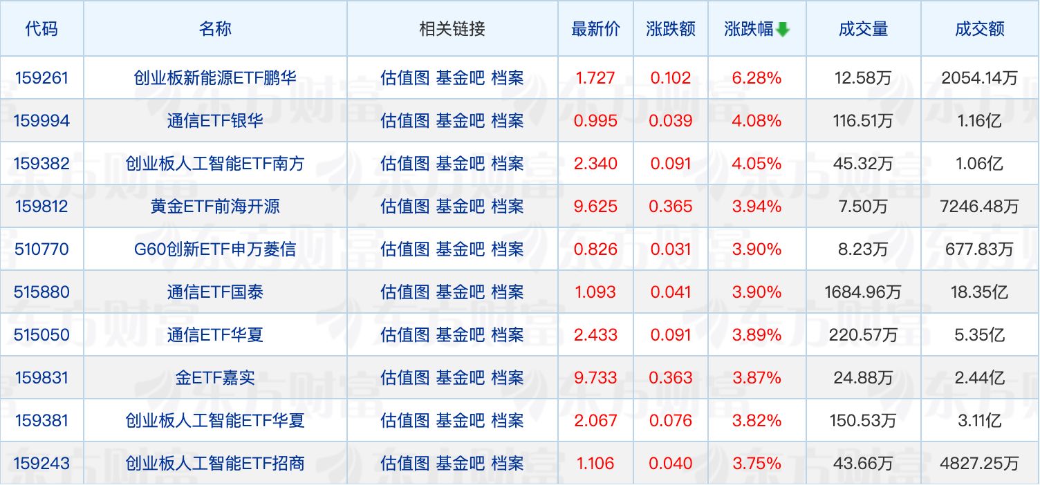 具体来看,创业板新能源ETF鹏华领涨6.28%,多只通信ETF、创业板人工智能ETF走强。