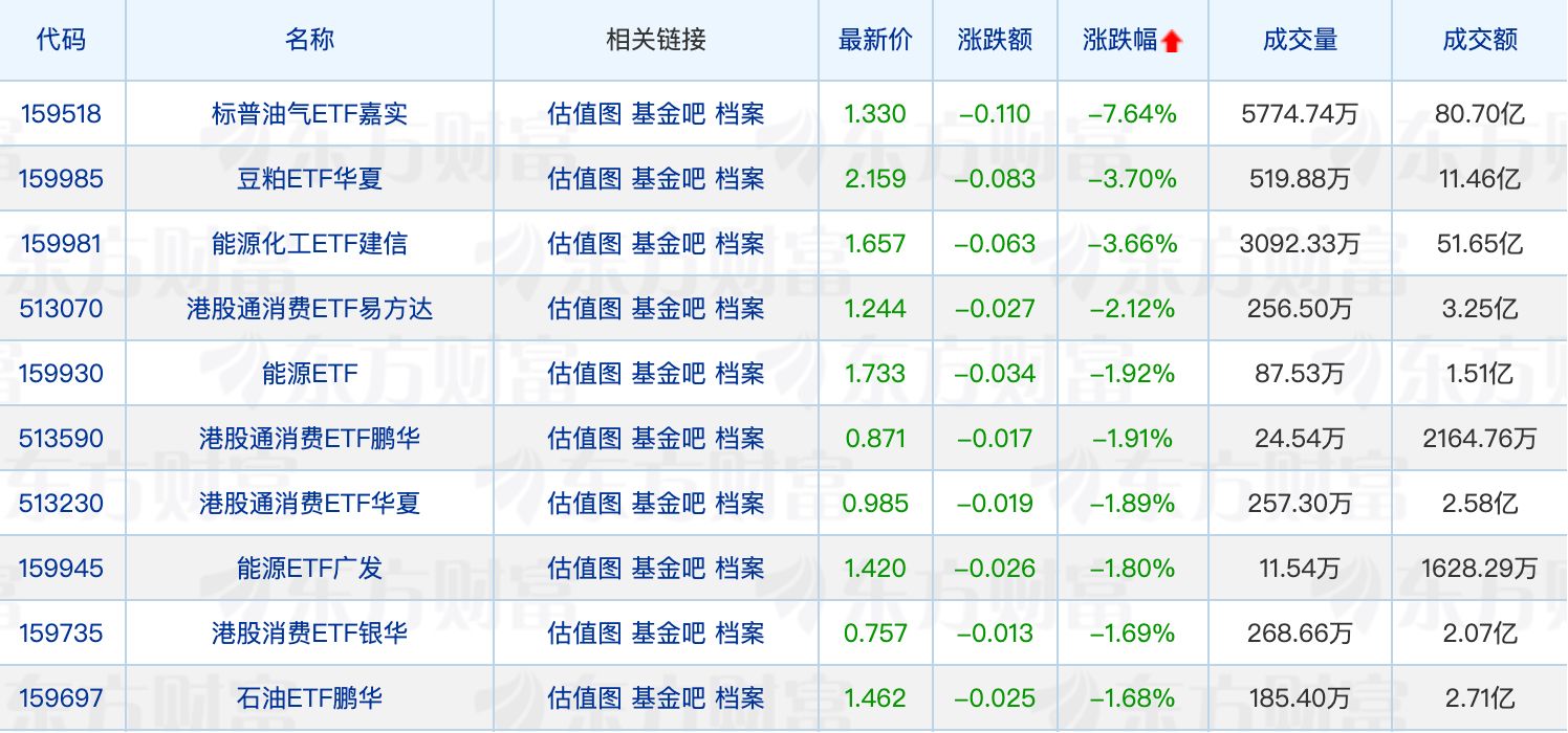 标普油气ETF嘉实领跌7.64%,能源相关ETF悉数回调。