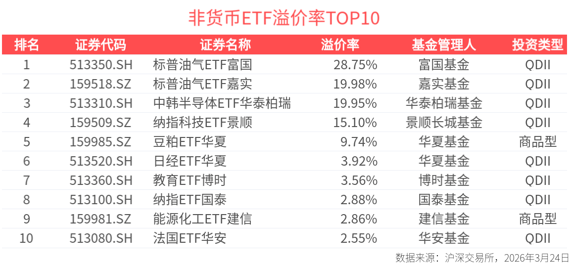 截至今日收盘,标普石油与天然气的勘探与生产精选行业指数溢价居前,标普油气ETF富国、标普油气ETF嘉实,分别收盘溢价28.75%、19.98%;中证韩交所中韩半导体指数情绪高涨,中韩半导体ETF华泰柏瑞收盘溢价19.95%。