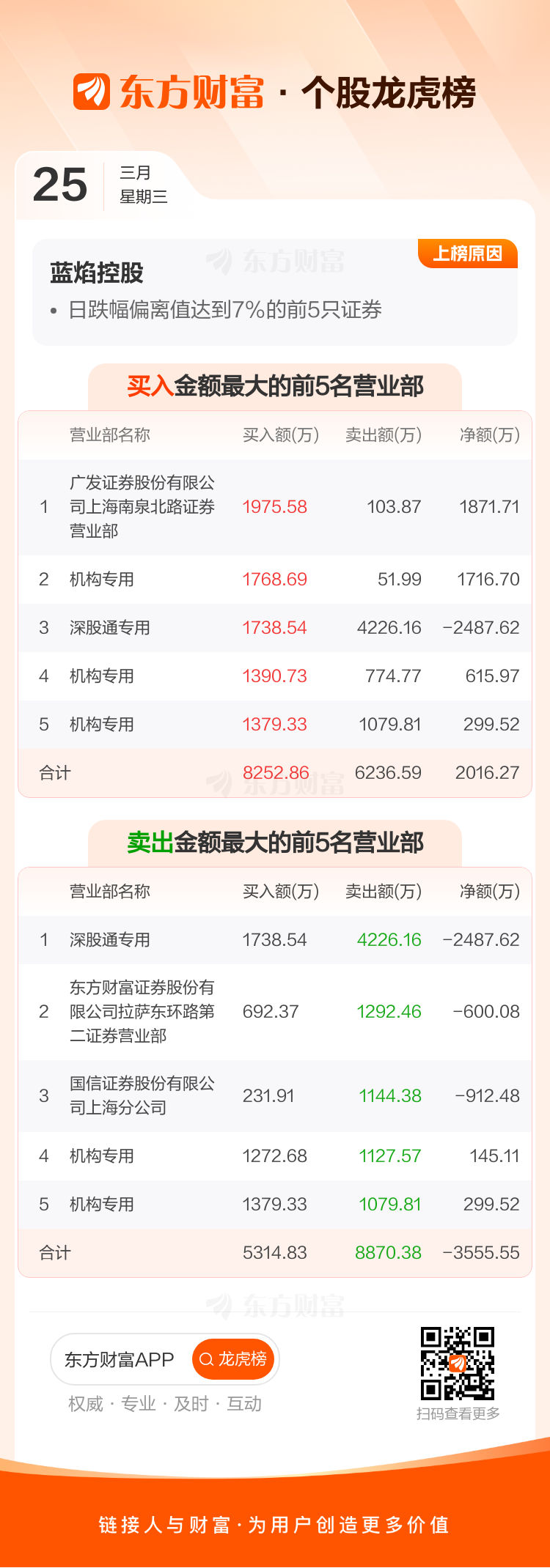 交易所2026年3月25日公布的交易公开信息显示,蓝焰控股因成为日跌幅偏离值达到7%的前5只证券上榜。蓝焰控股当日收报9.94元,涨跌幅-5.15%,偏离值-7.11%,换手率10.00%,成交额9.55亿。