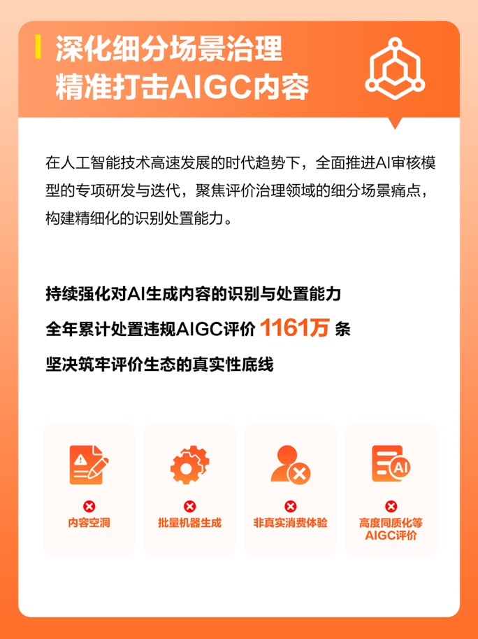 报告披露,2025年,大众点评率先引入AI智能体辅助人工审核评价,以线上化的物理世界信息作为“信息底座”,提升识别虚假评价的能力;分层处置AIGC评价共1161万条,守护AI时代稀缺的“真实”;升级星级评分规则,聚焦“赠品换好评”违规行为,高强度促评商户数下降42%;上线“点评众议厅”,让规则更贴合真实消费场景,持续推动评价生态的社会共治。