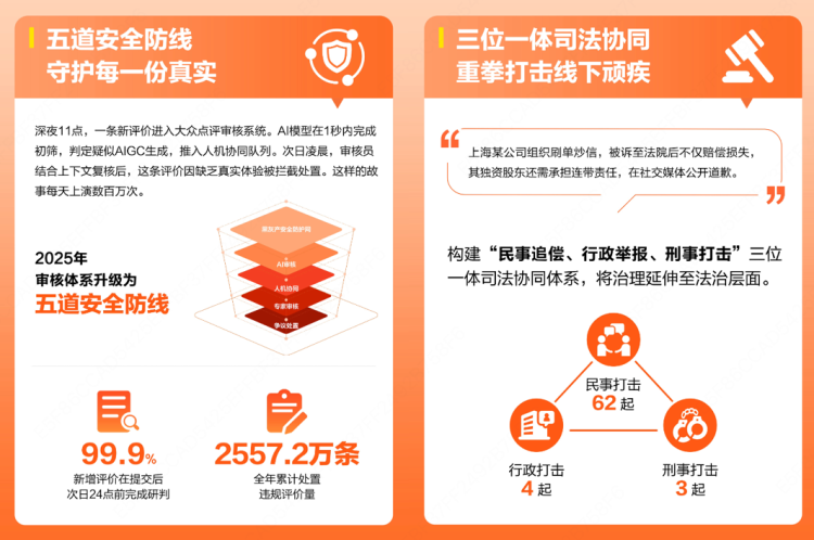 “AI智能体+人工”的审核模式同时用于违规评价识别打击。报告显示,2025年,大众点评持续打击“虚假刷评”“替代写评”“利益交换评价”等行为,累计处置违规评价2557.2万条,警告违规商户超71.2万家、处罚超8.7万家;建立民事追偿、行政举报、刑事打击三位一体的机制,联动社会各方打击“刷单炒信”黑灰产,全年民事打击案例达到62起,行政打击4起,刑事打击3起。