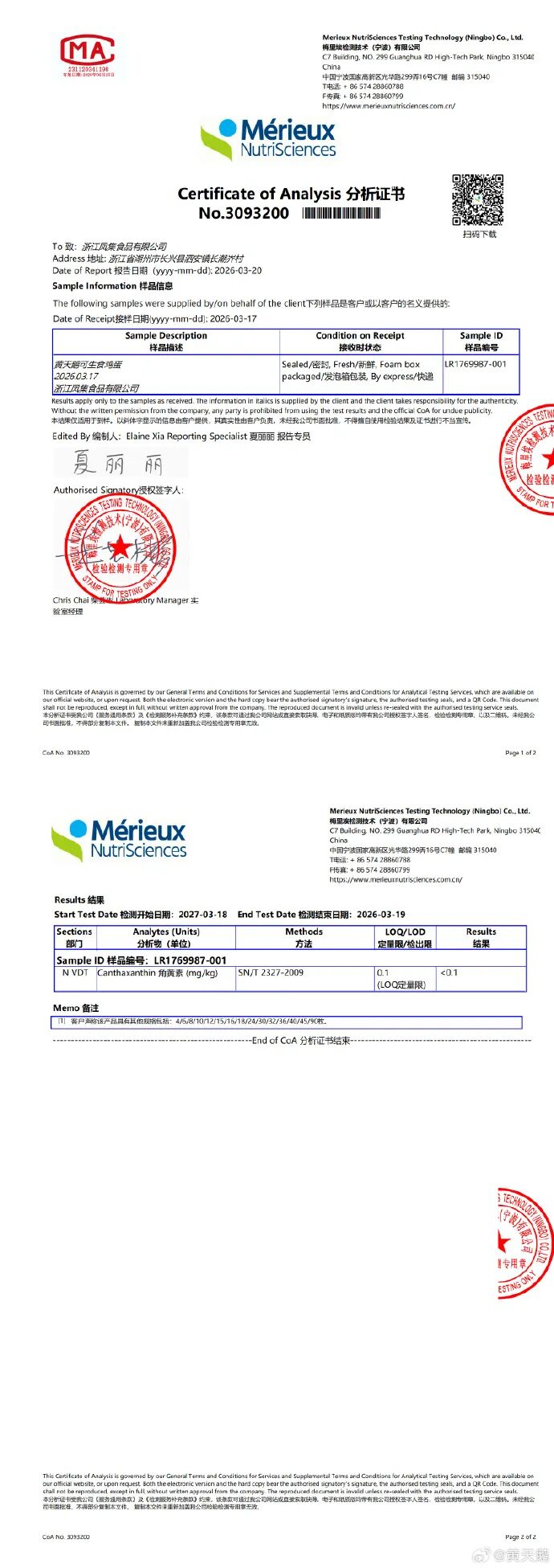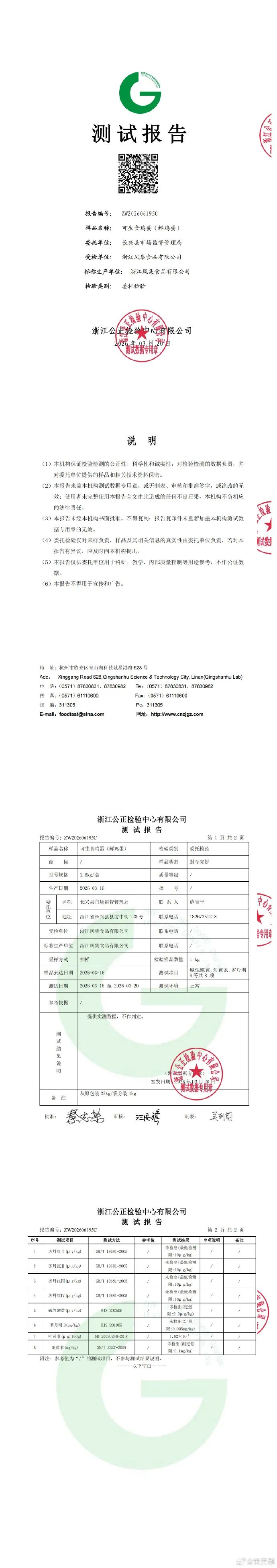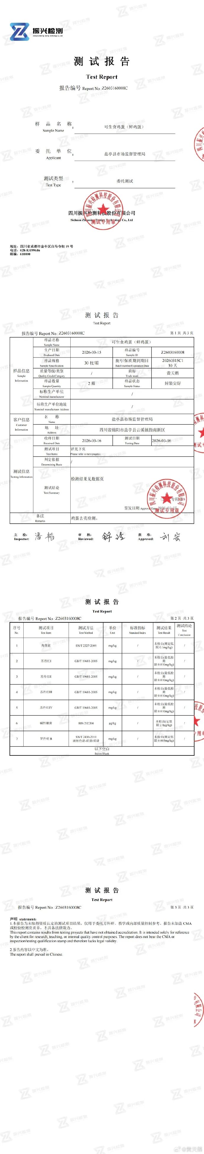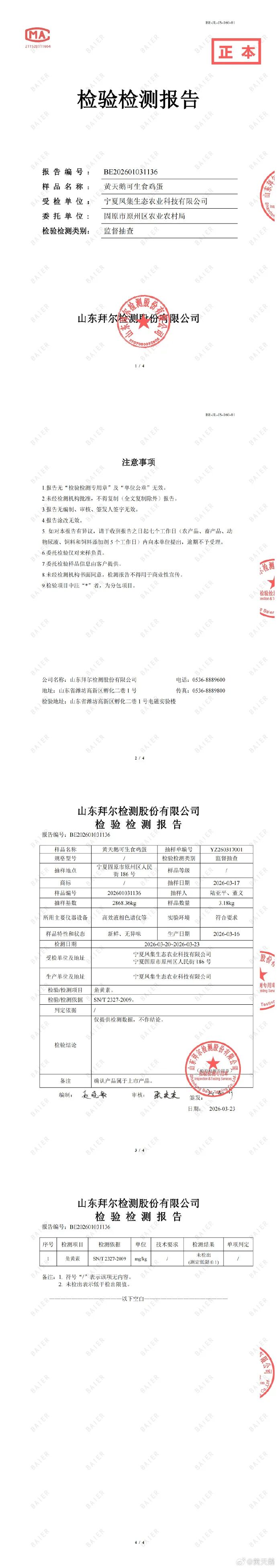 目前,三地监管部门抽检及企业自检的检测结果已反馈至企业,均为黄天鹅鸡蛋未检出角黄素(检测报告附后)。