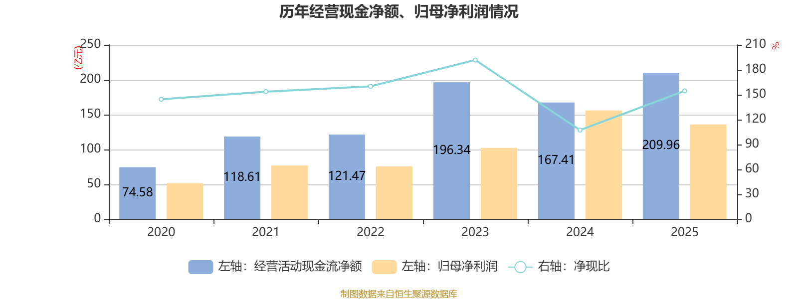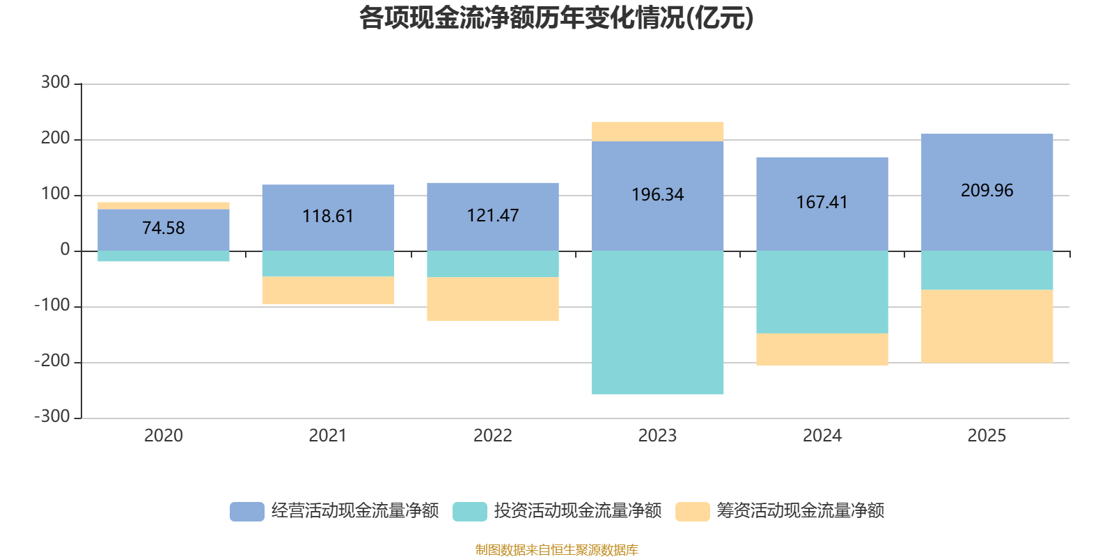 2025年,公司经营活动现金流净额为209.96亿元,同比增长25.42%;筹资活动现金流净额-131.16亿元,同比减少73.55亿元;投资活动现金流净额-70.46亿元,上年同期为-148.64亿元。