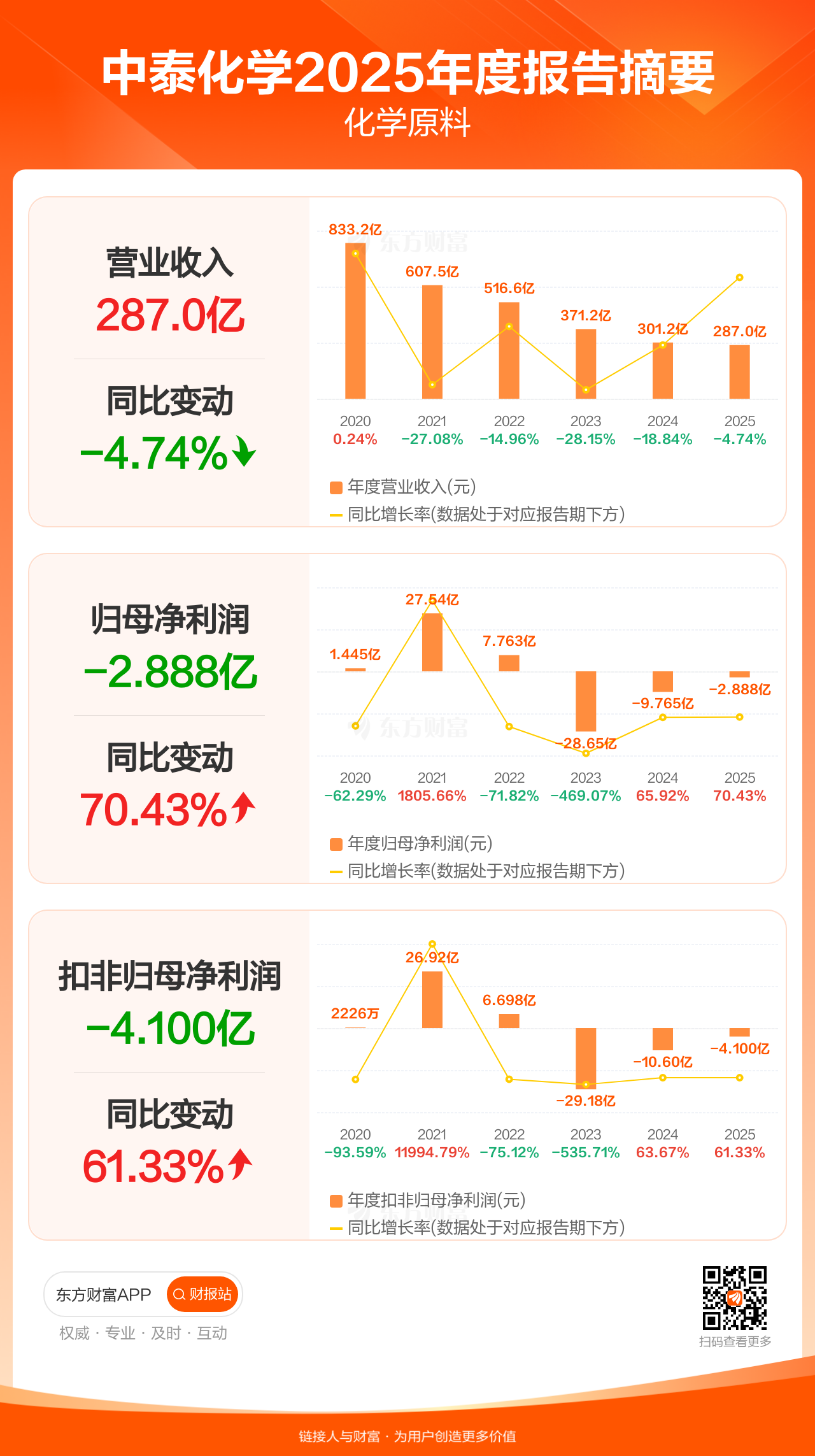 中泰化学3月26日发布2025年年报显示,公司全年实现营业收入286.96亿元,同比下滑4.74%;归母净利润-2.89亿元;扣非归母净利润-4.10亿元。