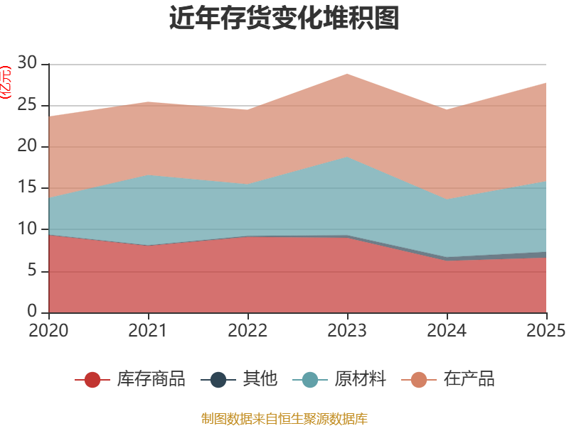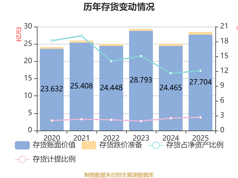从存货变动来看,截至2025年末,公司存货账面价值为27.7亿元,占净资产的12.07%,较上年末增加3.24亿元。其中,存货跌价准备为7632.4万元,计提比例为2.68%。