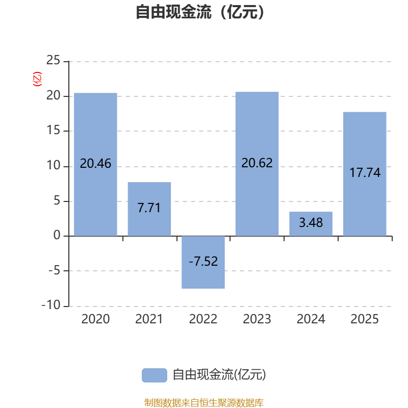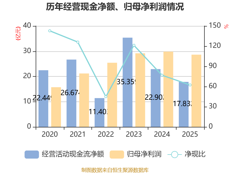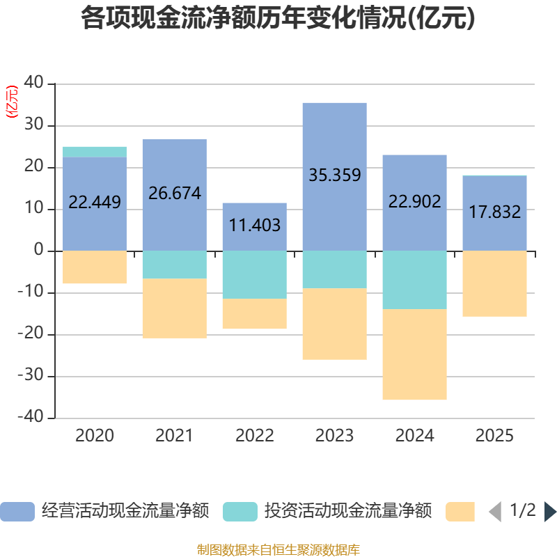 截至2025年,公司经营活动现金流净额为17.83亿元,同比下降22.14%;筹资活动现金流净额-15.8亿元,同比增加5.88亿元;投资活动现金流净额2003.49万元,上年同期为-14.01亿元。