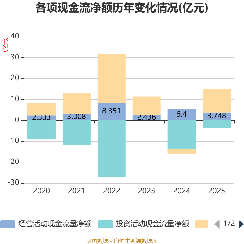 截至2025年,公司经营活动现金流净额为3.75亿元,同比下降30.6%;筹资活动现金流净额11.24亿元,同比增加13.7亿元;投资活动现金流净额-3.6亿元,上年同期为-13.72亿元。