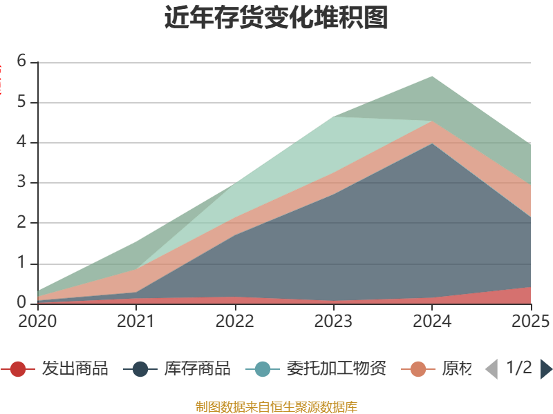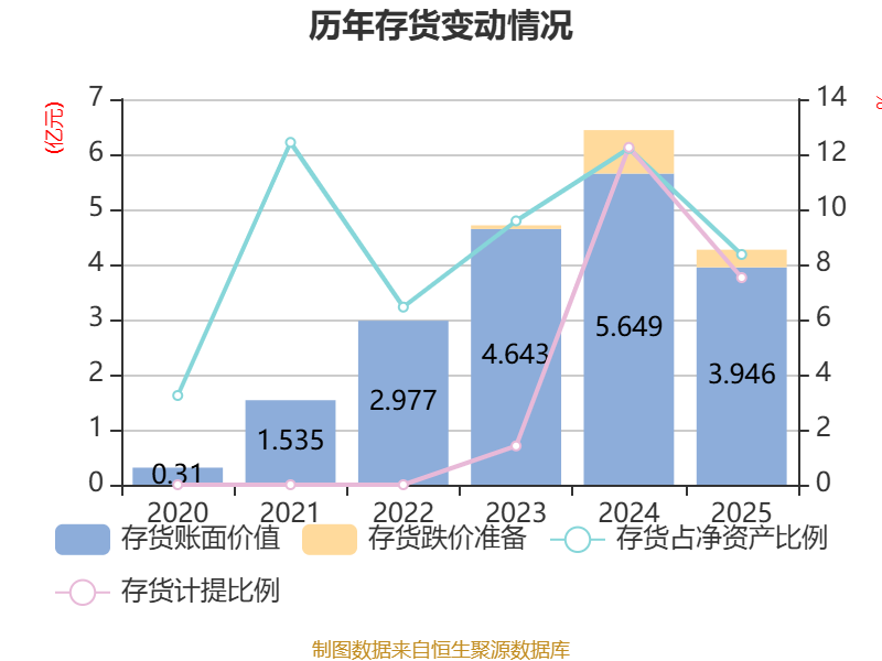 从存货变动来看,截至2025年末,公司存货账面价值为3.95亿元,占净资产的8.36%,较上年末减少1.7亿元。其中,存货跌价准备为3209.9万元,计提比例为7.52%。
