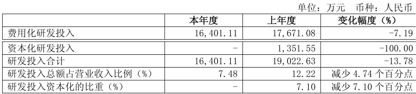 2025年全年,公司研发投入金额为1.64亿元,同比下降13.78%;研发投入占营业收入比例为7.48%,相比上年同期下降4.74个百分点。