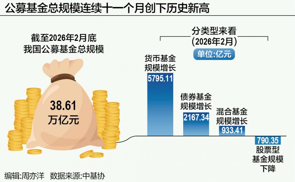 截至2026年2月底,我国公募基金总规模达38.61万亿元,首次突破38万亿元,并且已连续十一个月创下历史新高。分类型来看,2026年2月货币基金规模增长5795.11亿元,贡献最大规模增量。