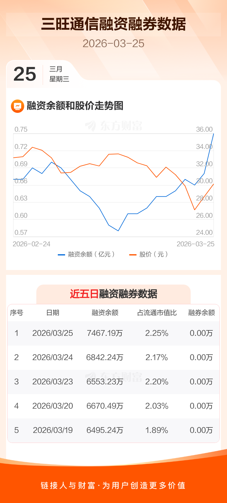 交易所最新数据显示,三旺通信于2026年3月25日获融资买入1616.21万元,融资偿还991.26万元,当日融资净买入624.95万元。目前,该股融资余额7467.19万,占流通市值比例为2.25%。