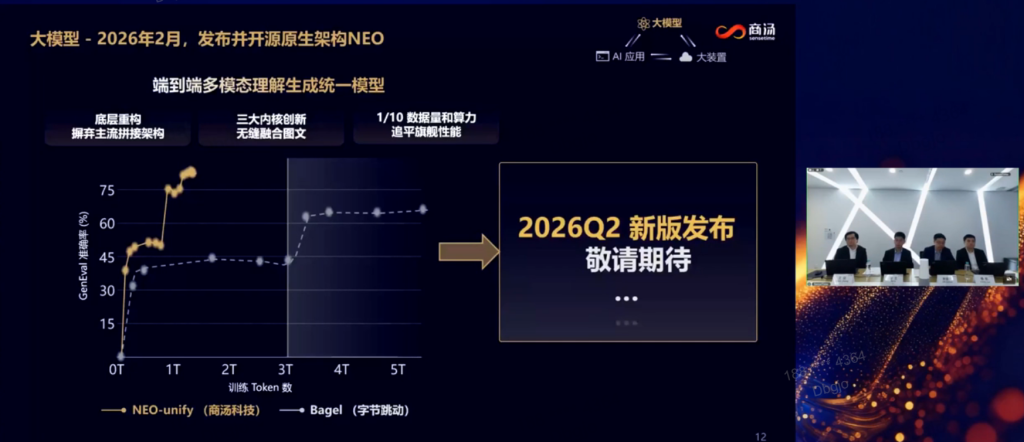 林达华指出,纯语言数据已经见顶,语言和视觉的深度融合,将会成为突破AI智力上限的关键路径。在软件AI时代,很多复杂业务场景都会涉及多模态信息综合处理。将智能体的视觉能力和语言处理深度连接,可以显著提升复杂任务的成功率和效率,并且大幅度降低token消耗。商汤此前推出的NEO架构打破了传统拼接架构,进行了底层的多模态原生改造,提升了学习和推理效率,用1/10的数据量就能达到SOTA(最先进,State-Of-The-Art)性能。