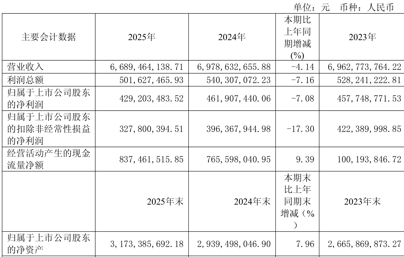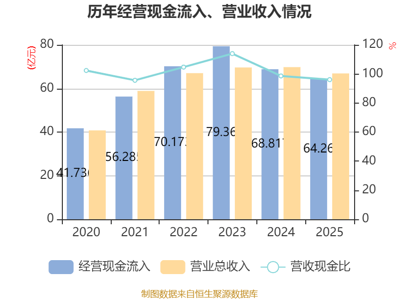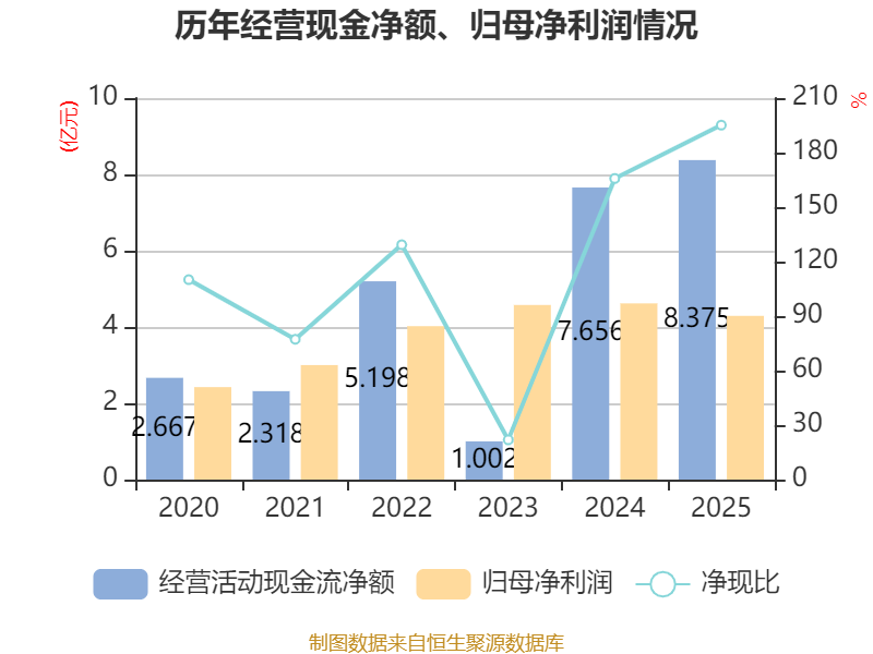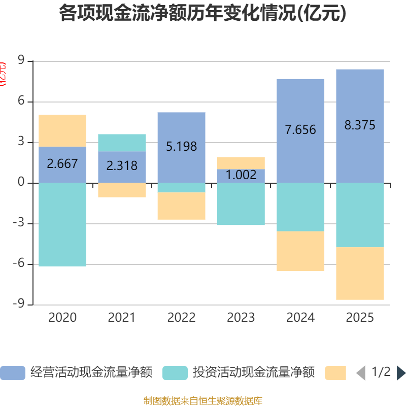 截至2025年,公司经营活动现金流净额为8.37亿元,同比增长9.39%;筹资活动现金流净额-3.89亿元,同比减少9531.4万元;投资活动现金流净额-4.77亿元,上年同期为-3.59亿元。