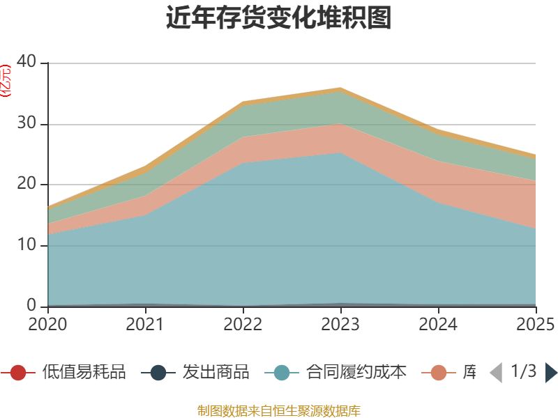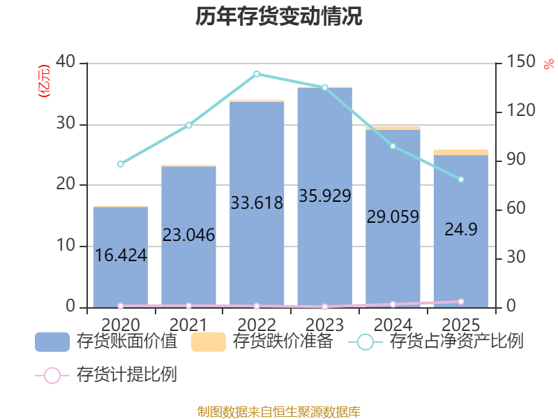 从存货变动来看,截至2025年末,公司存货账面价值为24.9亿元,占净资产的78.47%,较上年末减少4.16亿元。其中,存货跌价准备为8940.61万元,计提比例为3.47%。