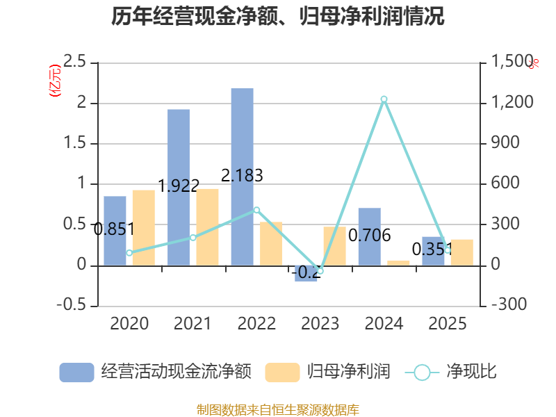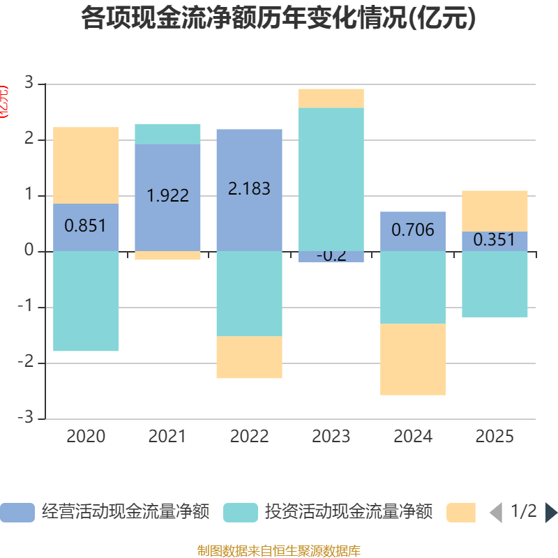 截至2025年,公司经营活动现金流净额为3513.73万元,同比下降50.24%;筹资活动现金流净额7298.08万元,同比增加2.01亿元;投资活动现金流净额-1.19亿元,上年同期为-1.3亿元。