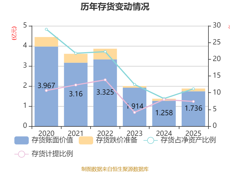 从存货变动来看,截至2025年末,公司存货账面价值为1.74亿元,占净资产的11.15%,较上年末增加4786.26万元。其中,存货跌价准备为1383.63万元,计提比例为7.38%。
