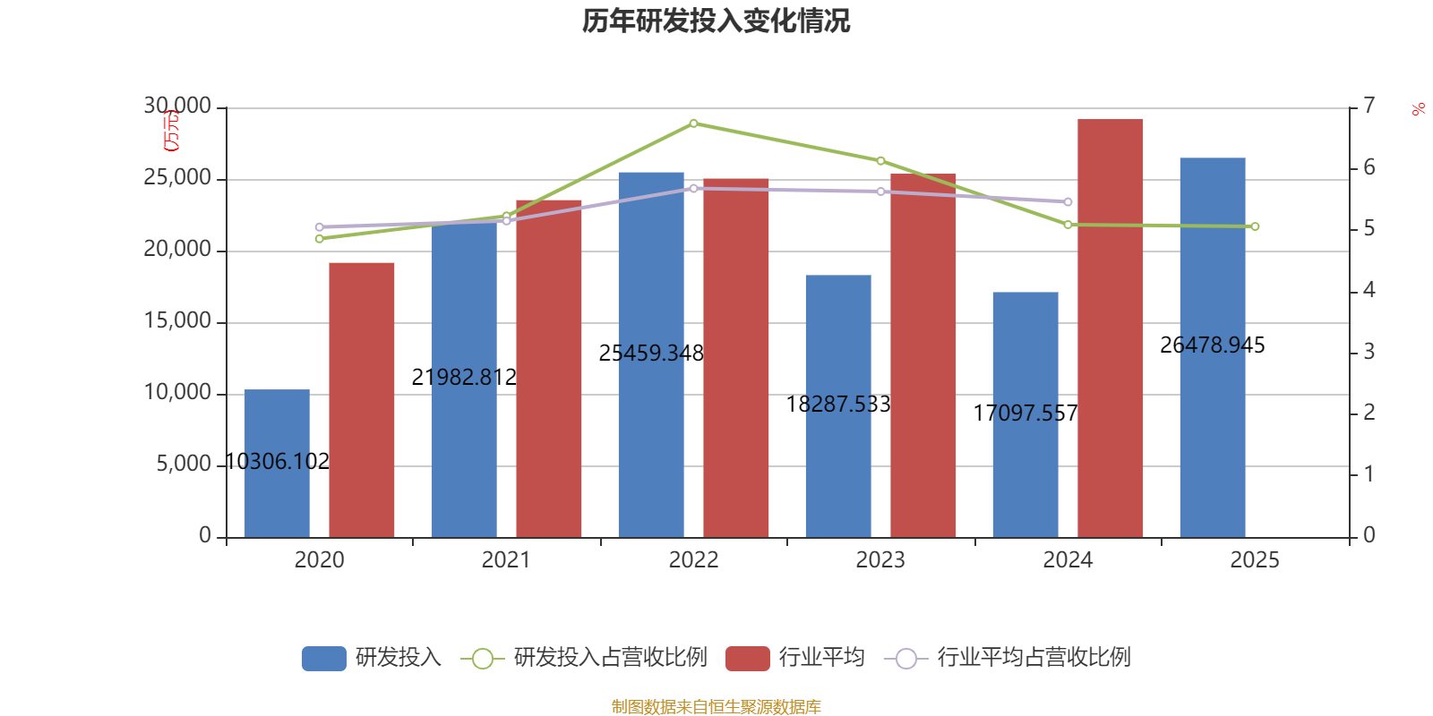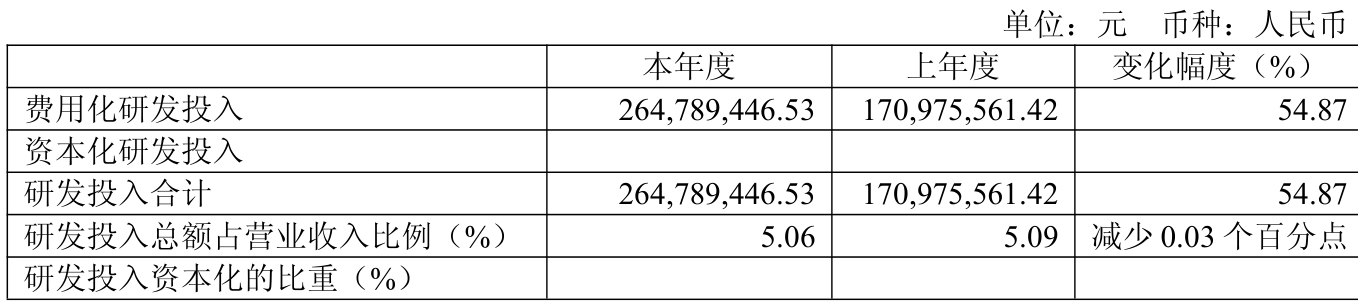2025年全年,公司研发投入金额为2.65亿元,同比增长54.87%;研发投入占营业收入比例为5.06%,相比上年同期下降0.03个百分点。