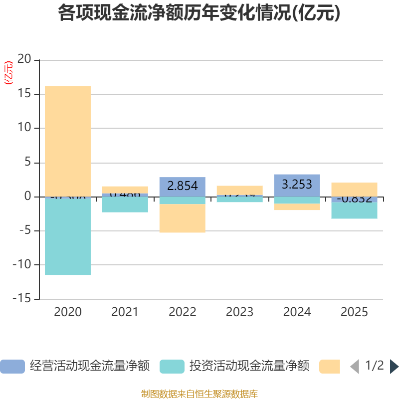 截至2025年,公司经营活动现金流净额为-8318.46万元,同比减少4.08亿元;筹资活动现金流净额2.06亿元,同比增加2.98亿元;投资活动现金流净额-2.38亿元,上年同期为-1.03亿元。