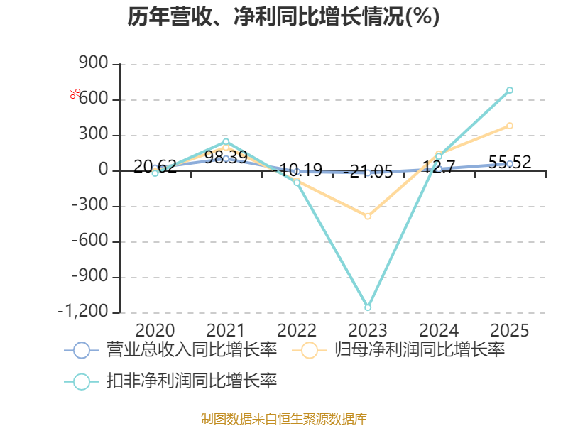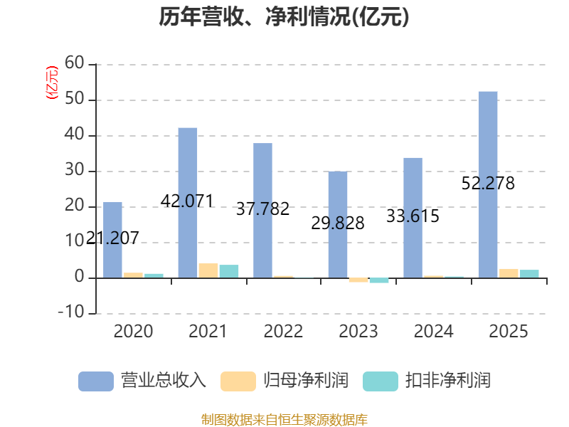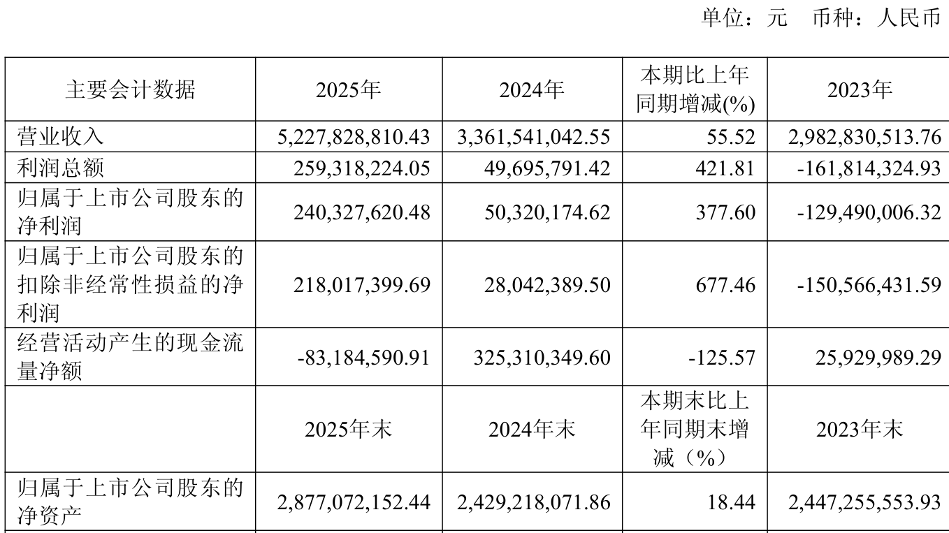 中证智能财讯南亚新材(688519)3月26日披露2025年年度报告。2025年,公司实现营业总收入52.28亿元,同比增长55.52%;归母净利润2.4亿元,同比增长377.60%;扣非净利润2.18亿元,同比增长677.46%;经营活动产生的现金流量净额为-8318.46万元,上年同期为3.25亿元;报告期内,南亚新材基本每股收益为1.07元,加权平均净资产收益率为9.12%。公司2025年度分配预案为:拟向全体股东每10股派现3.2元(含税)。