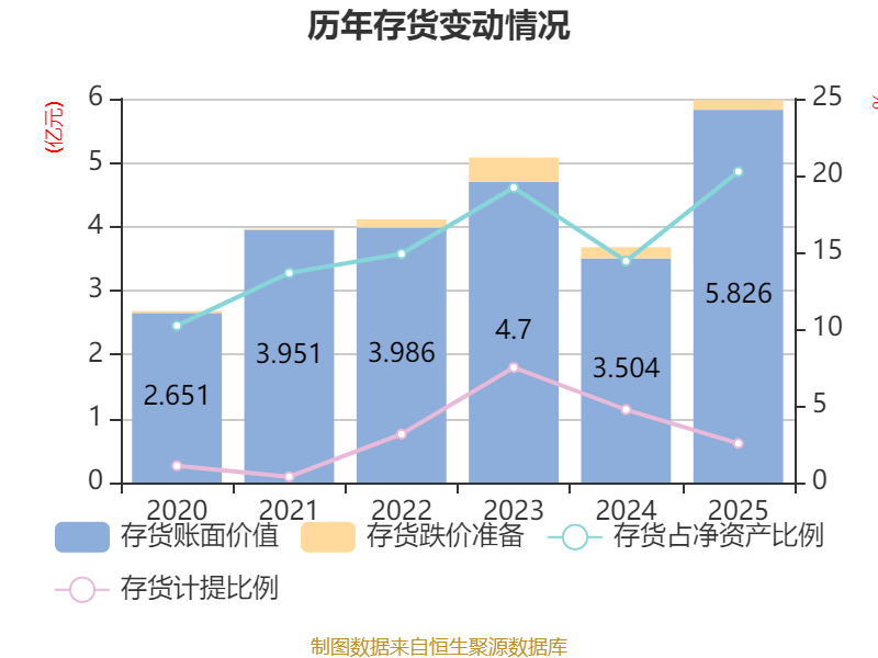 从存货变动来看,截至2025年末,公司存货账面价值为5.83亿元,占净资产的20.25%,较上年末增加2.32亿元。其中,存货跌价准备为1523.32万元,计提比例为2.55%。