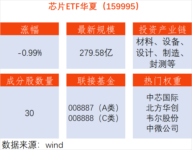资料显示,芯片ETF(159995)跟踪国证芯片指数,30只成分股集合A股芯片产业中材料、设备、设计、制造、封装和测试等龙头企业,其中包括中芯国际、寒武纪、长电科技、北方华创等。