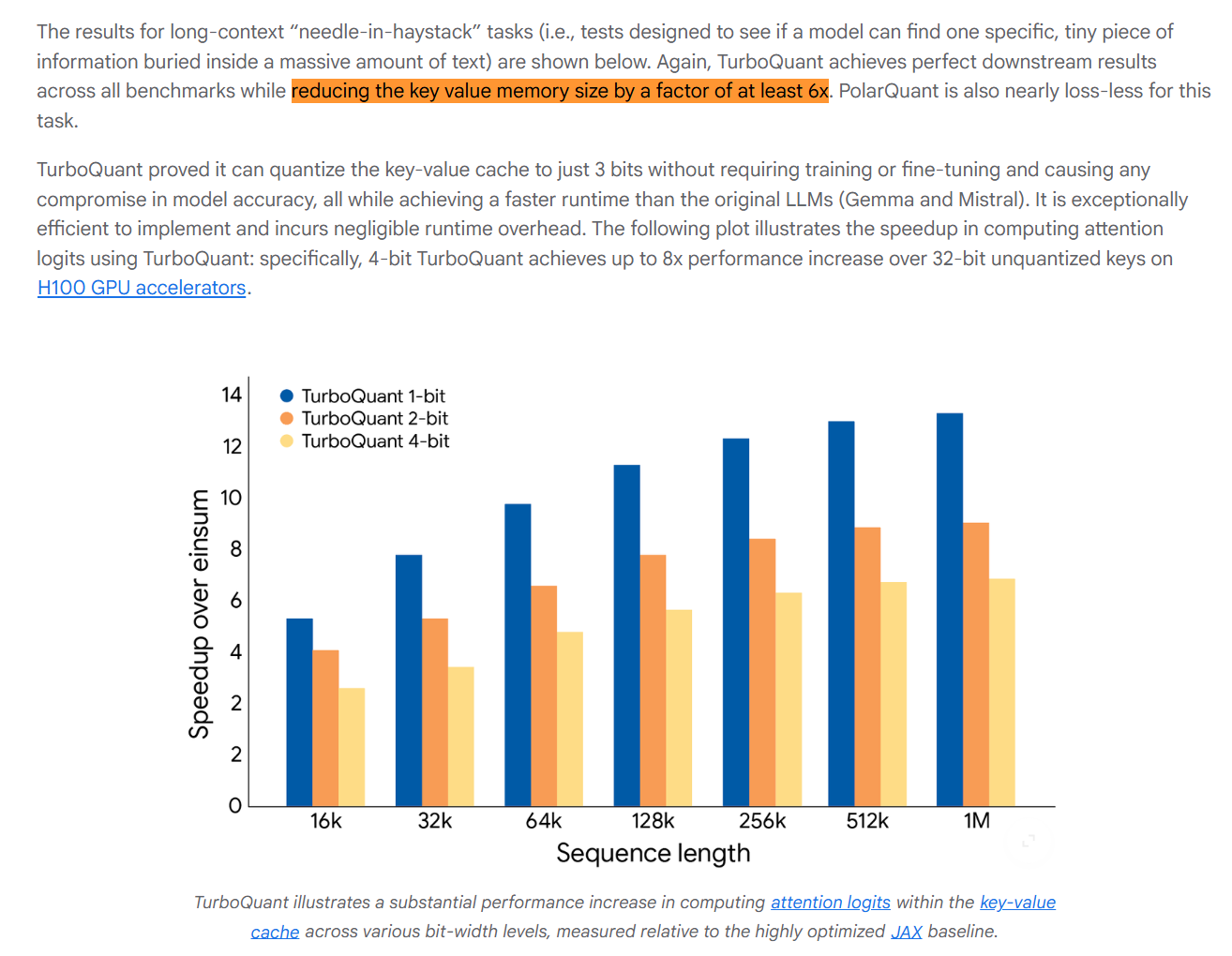 谷歌近日推出了一种可能降低人工智能系统内存需求的压缩算法TurboQuant。根据谷歌介绍,TurboQuant压缩技术旨在降低大语言模型和向量搜索引擎的内存占用。该算法主要针对AI系统中用于存储高频访问信息的键值缓存(key-value cache)瓶颈问题。随着上下文窗口变大,这些缓存正成为主要的内存瓶颈。TurboQuant可在无需重新训练或微调模型的情况下,将键值缓存压缩至3bit精度,同时基本保持模型准确率不受影响。对包括Gemma、Mistral等开源模型的测试显示,该技术可实现约6倍的键值缓存内存压缩效果。此外,在英伟达H100加速器上的测试结果显示,与未量化的键向量相比,该算法最高可实现约8倍性能提升。研究人员也表示,这项技术的应用不局限于AI模型,还包括支撑大规模搜索引擎的向量检索能力。谷歌计划于4月的国际学习表征会议(ICLR 2026)上展示TurboQuant技术。
