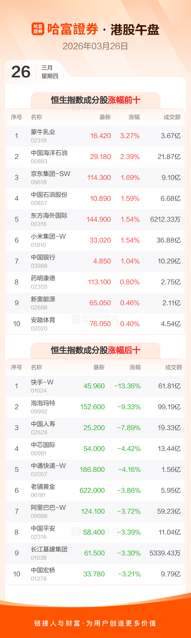 港股3月26日午盘走低,恒生指数收报24988.04点,跌347.91点,跌幅1.37%;恒生科技指数收报4817.15点,跌105.79点,跌幅2.15%。恒生指数成分股中蒙牛乳业、中国海洋石油、京东集团-SW涨幅居前,快手-W、泡泡玛特、中国人寿跌幅靠前。恒生科技指数成分股中金山软件、零跑汽车、京东集团-SW涨幅居前,快手-W、中芯国际、华虹半导体跌幅靠前。