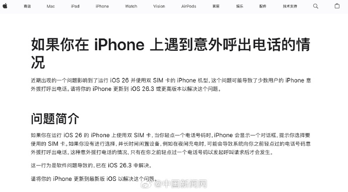 苹果官网发布信息,回应此前消费者反映手机半夜自动打电话。苹果方面称,如果在运行iOS26的iPhone上使用双SIM卡,轻点一个电话号码时,iPhone会显示一个对话框,提示选择要使用的SIM卡。如果没有进行选择,并长时间闲置设备,例如在夜间充电时,可能会导致系统向之前轻点过的电话号码拨打电话。这一行为是软件问题导致的,已在iOS26.3中解决。