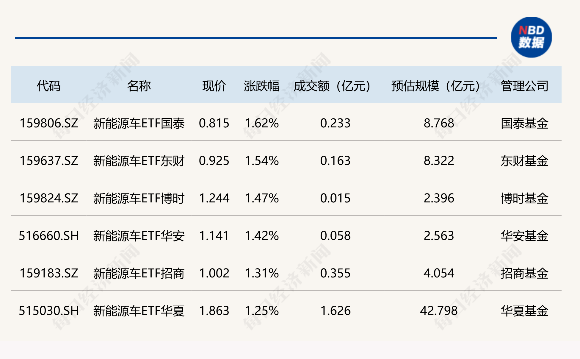 点评:新能源车ETF国泰、新能源车ETF东财早盘均涨超1.5%,ETF规模均超8亿元,而规模最大的是新能源车ETF华夏,预估规模超42亿元,上述ETF均跟踪中证新能源汽车指数。